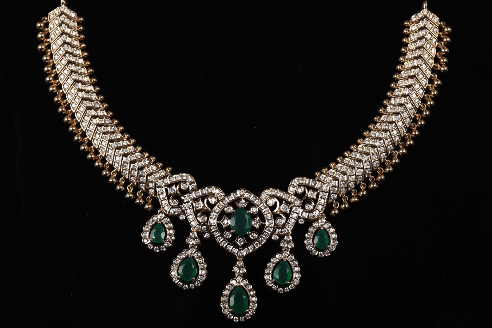 This exquisite necklace showcases a bold gold-toned structure adorned with meticulously set shimmering stones arranged in a refined geometric pattern. The centerpiece is elevated with rich emerald-green stones, surrounded by sparkling accents that enhance its royal appeal. Elegant emerald drop charms add graceful movement and grandeur, making this piece a true statement of sophistication.