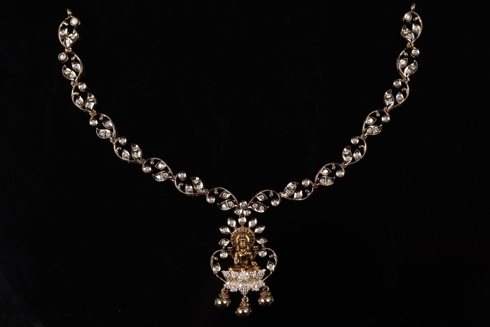 An elegant temple-inspired necklace featuring a radiant Lakshmi motif pendant framed with floral stone detailing and delicate gold bead drops. A timeless piece designed for weddings, poojas, and festive celebrations.