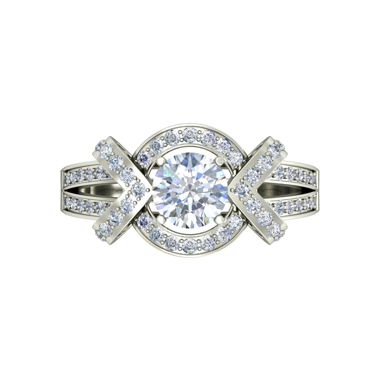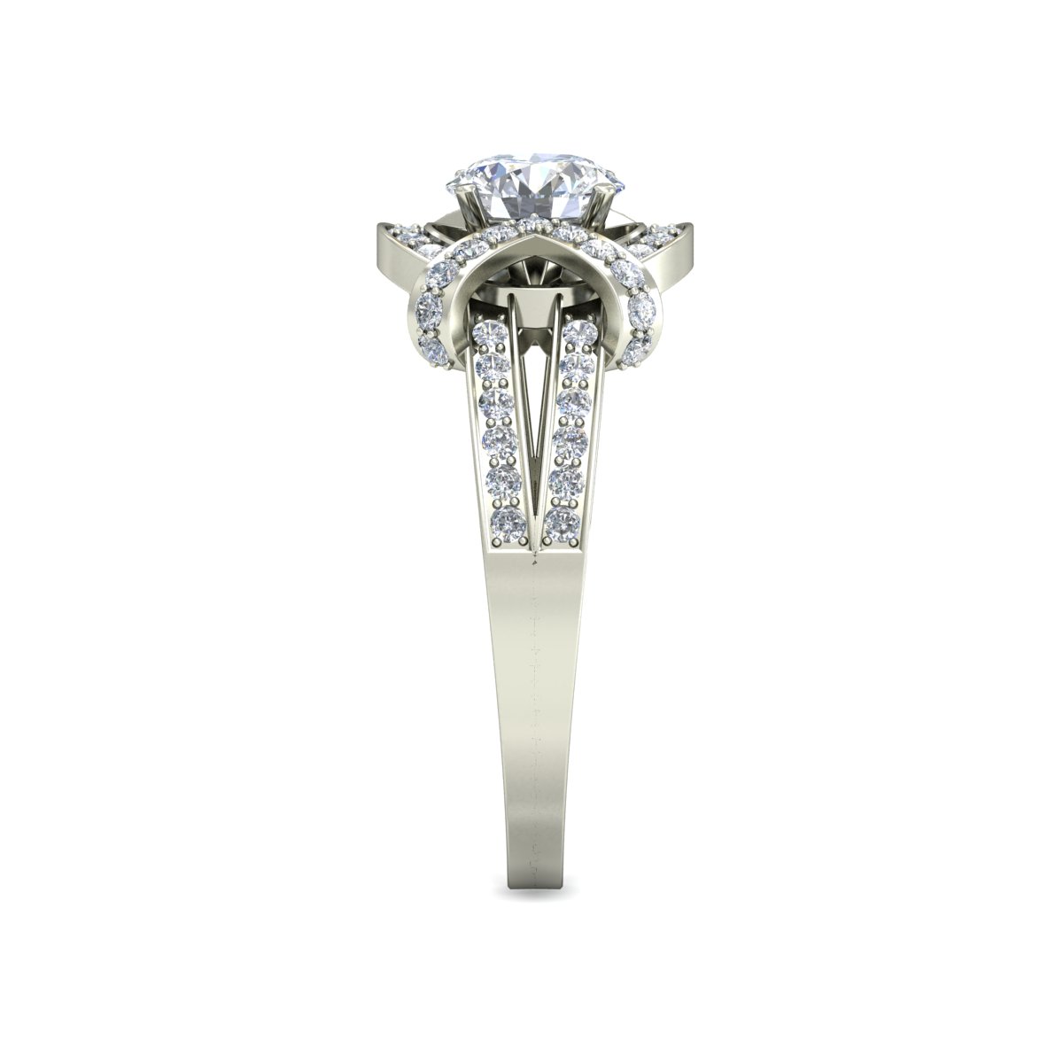 Band Design: Split shank with detailed diamond setting
